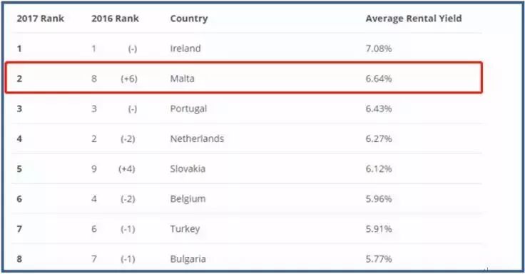 2017年8月WORDFIRST金融公司所提供的数据显示:马耳他的平均房产收益率相比2016年上升了6个位置,跃居欧洲第二,达到了6.64%。