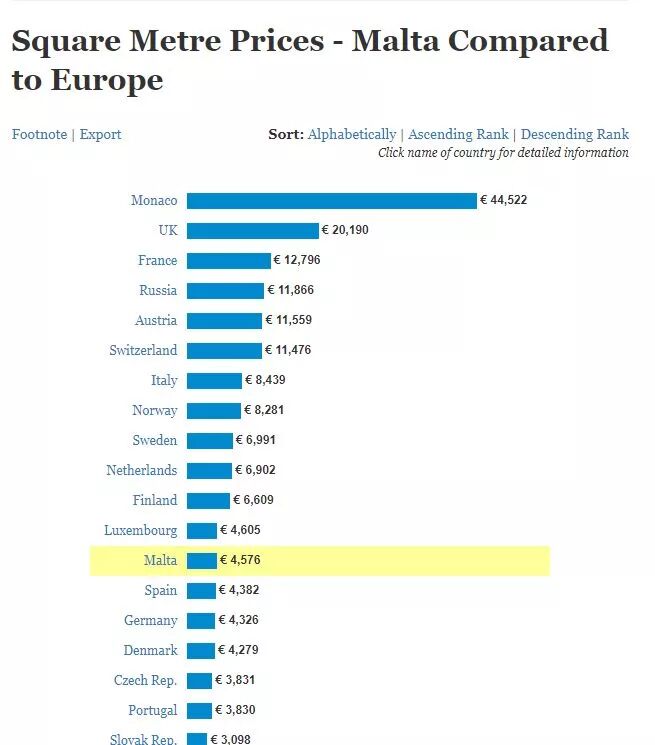 根据《全球房地产投资指导》2017年的数据显示,马耳他的房产均价为3577€/平方米,今年5月网站对所有数据进行了更新,其中马耳他房产均价更新为4576€/平方米,跟去年相比均价直接上涨了1000€。