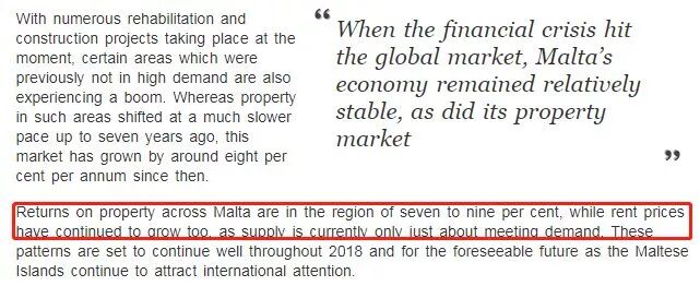 据《马耳他时报》2018年2月的报道中提到,目前马耳他房产供应仅达到市场需求的水平,马耳他房产投资回报率已达到7%-9%,并会持续增长。