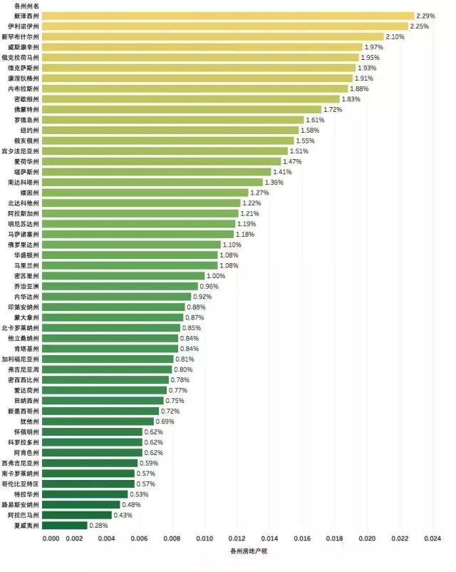 美国大部分地区的房产税在1%-1.5%之间,除非这里超级热门或者超级冷门都会导致房产税收高或者收低哦~