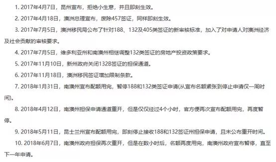 类似的事件曾在今年重复上演,而且有愈演愈烈之势。年初,南澳暂时关闭188/132类提名申请;年中,昆州和维州关闭了州担保申请;而就在今天,新州发出了它的第一个暂停申请通知。这些事件都在预示着一件事:澳洲变政在即,投资类移民或将提高申请条件以及后续投资要求!